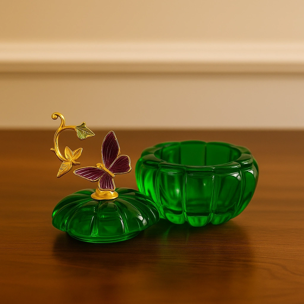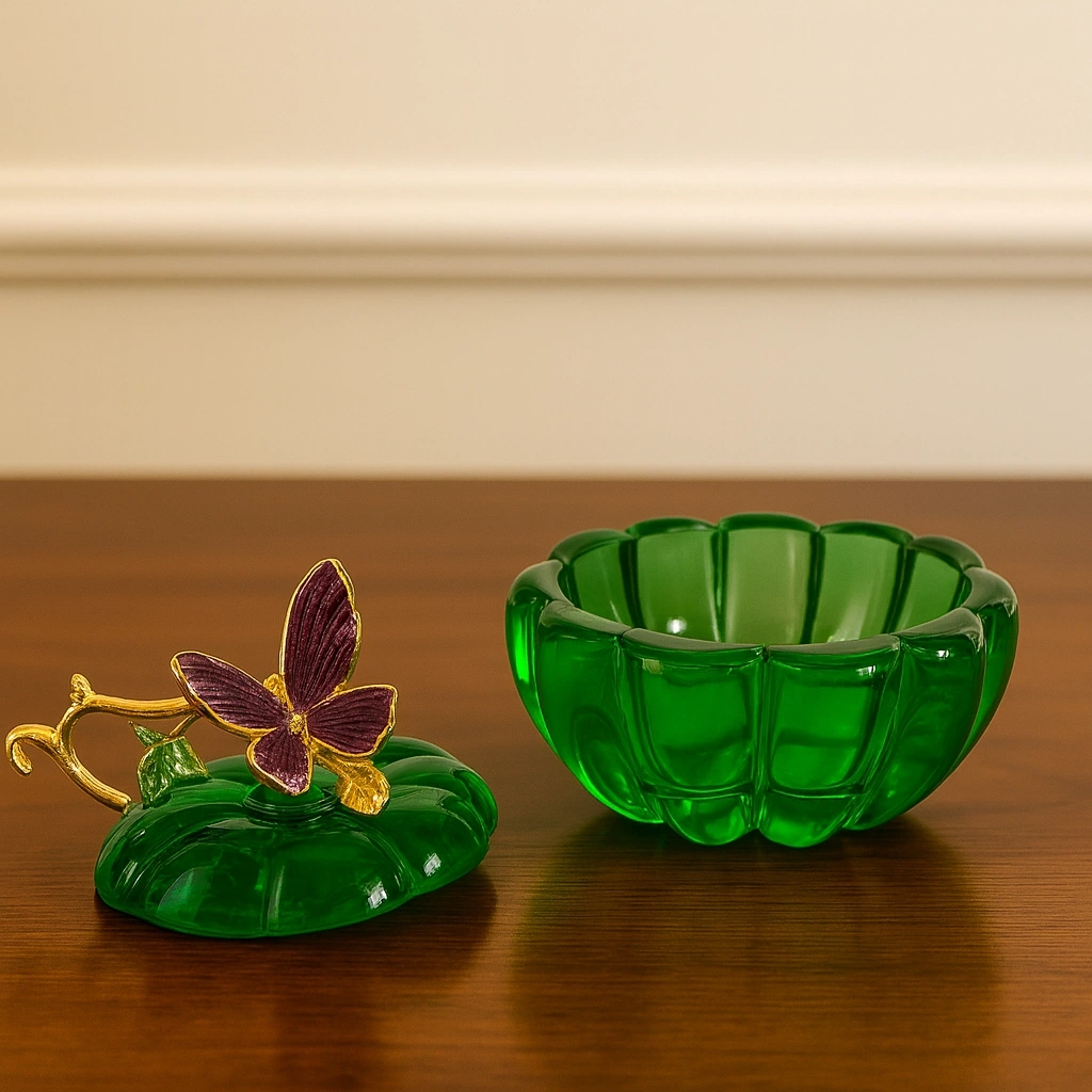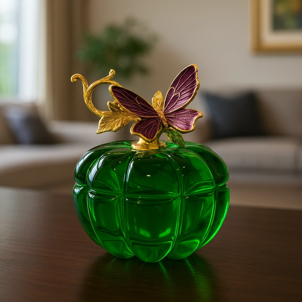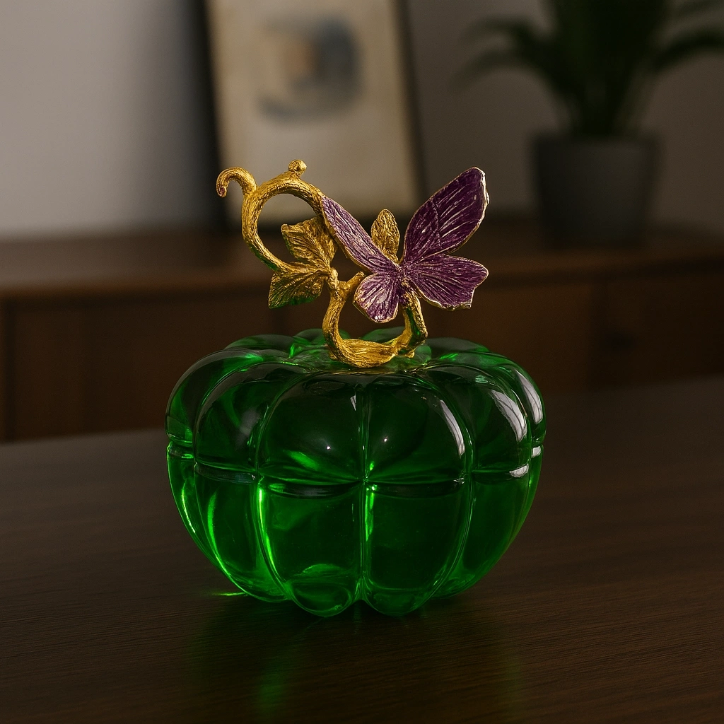 Yeşil kristal gövdesi ile dikkat çeken bu obje, üst kısmındaki altın tonlu yaprak ve mor renkteki zarif kelebek figürüyle adeta sanatsal bir dokunuş sunuyor.