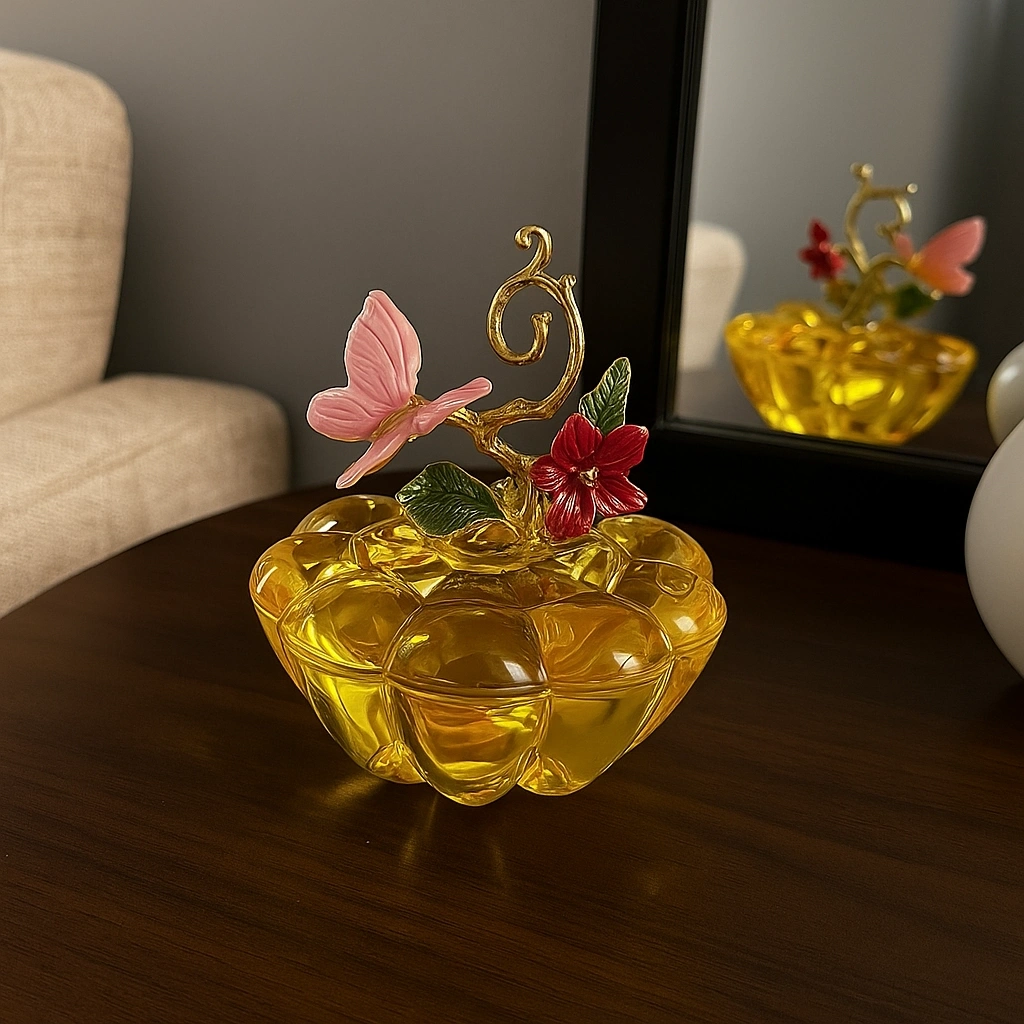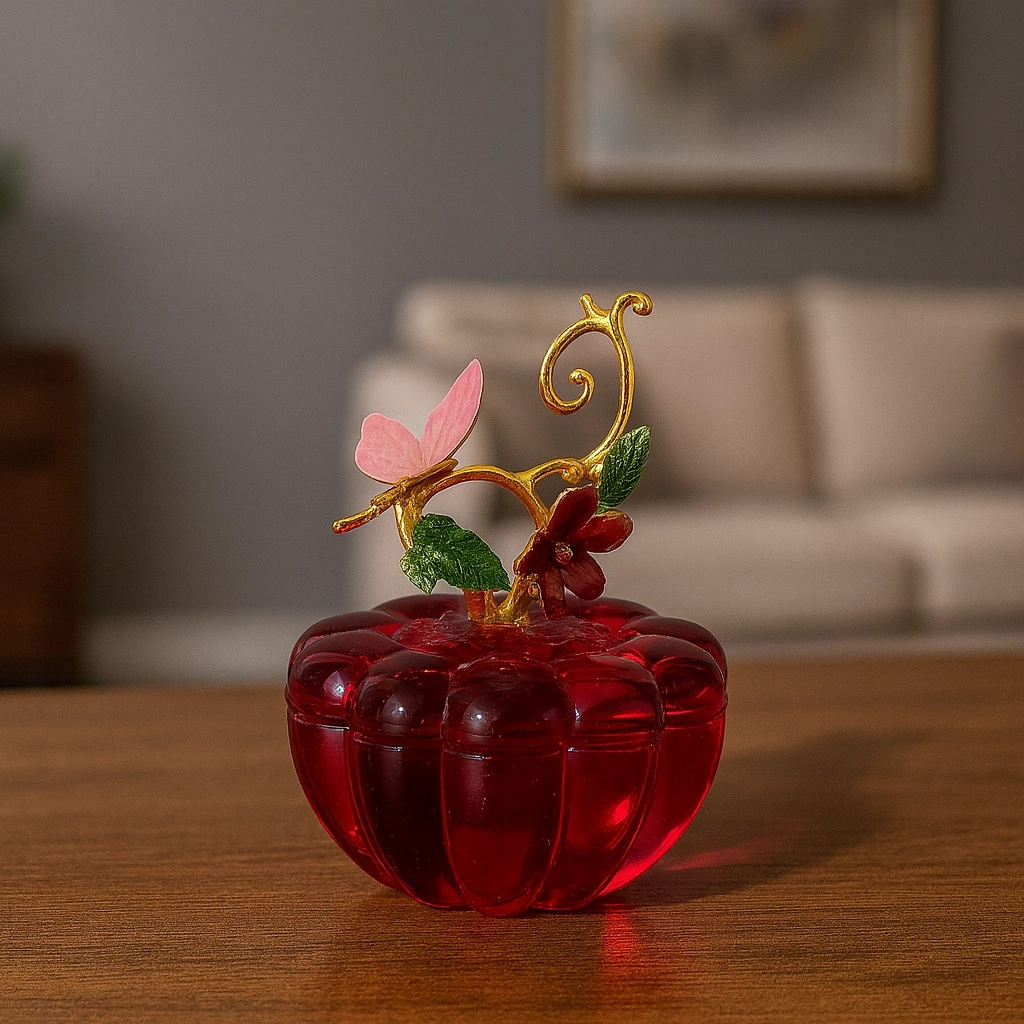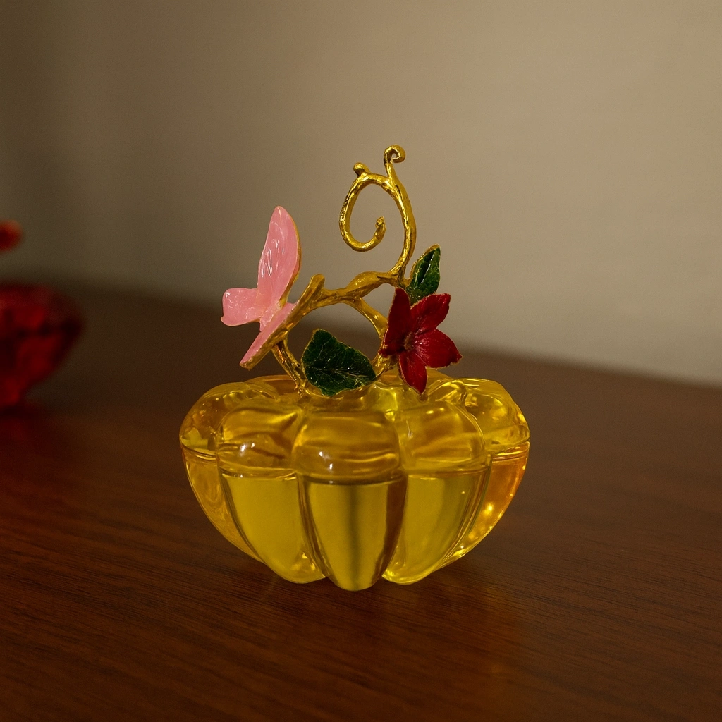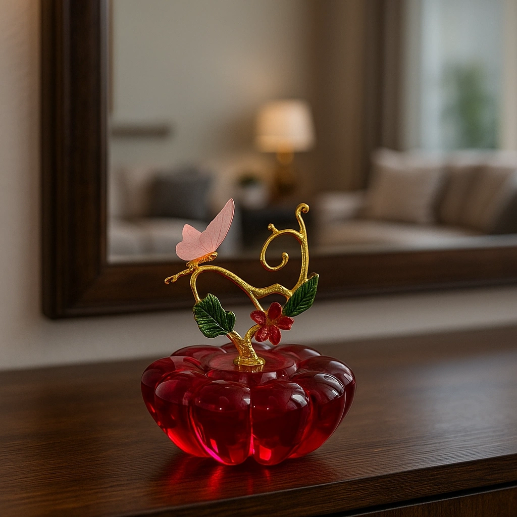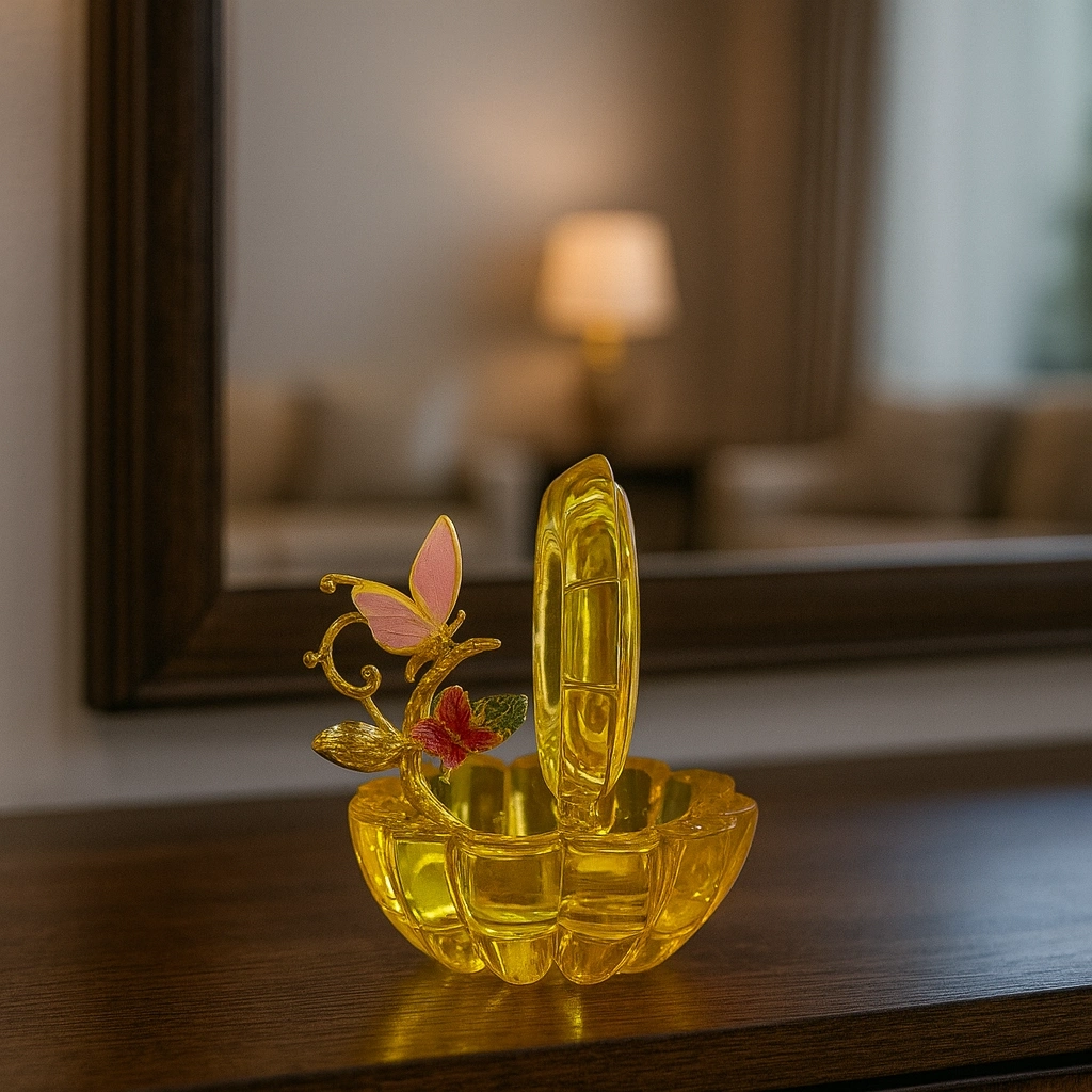 Yeşil kristal gövdesi ile dikkat çeken bu obje, üst kısmındaki altın tonlu yaprak ve mor renkteki zarif kelebek figürüyle adeta sanatsal bir dokunuş sunuyor.