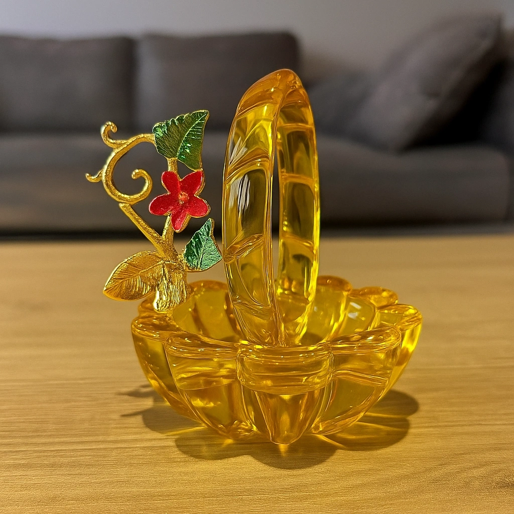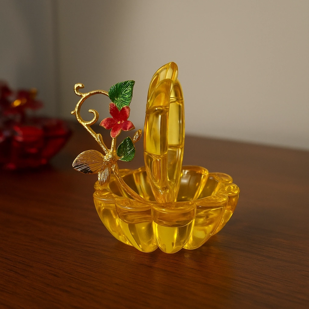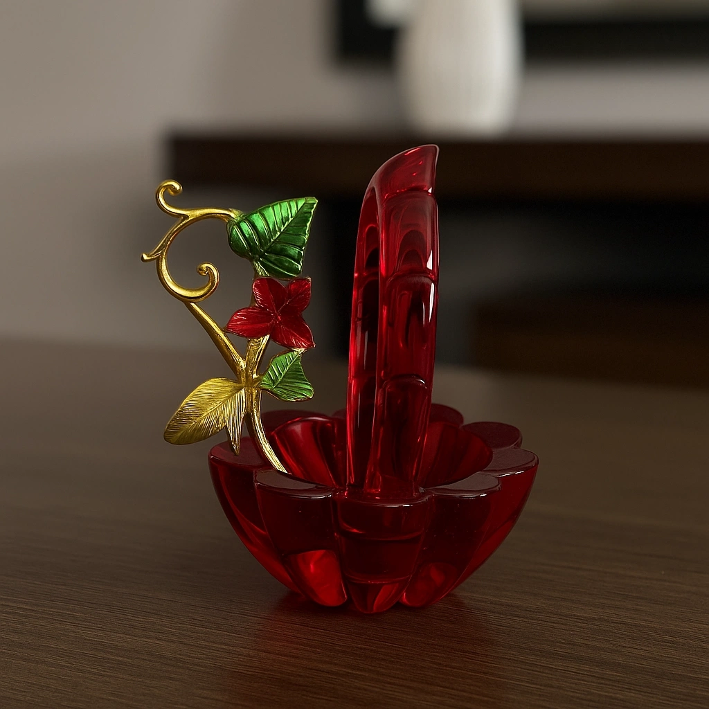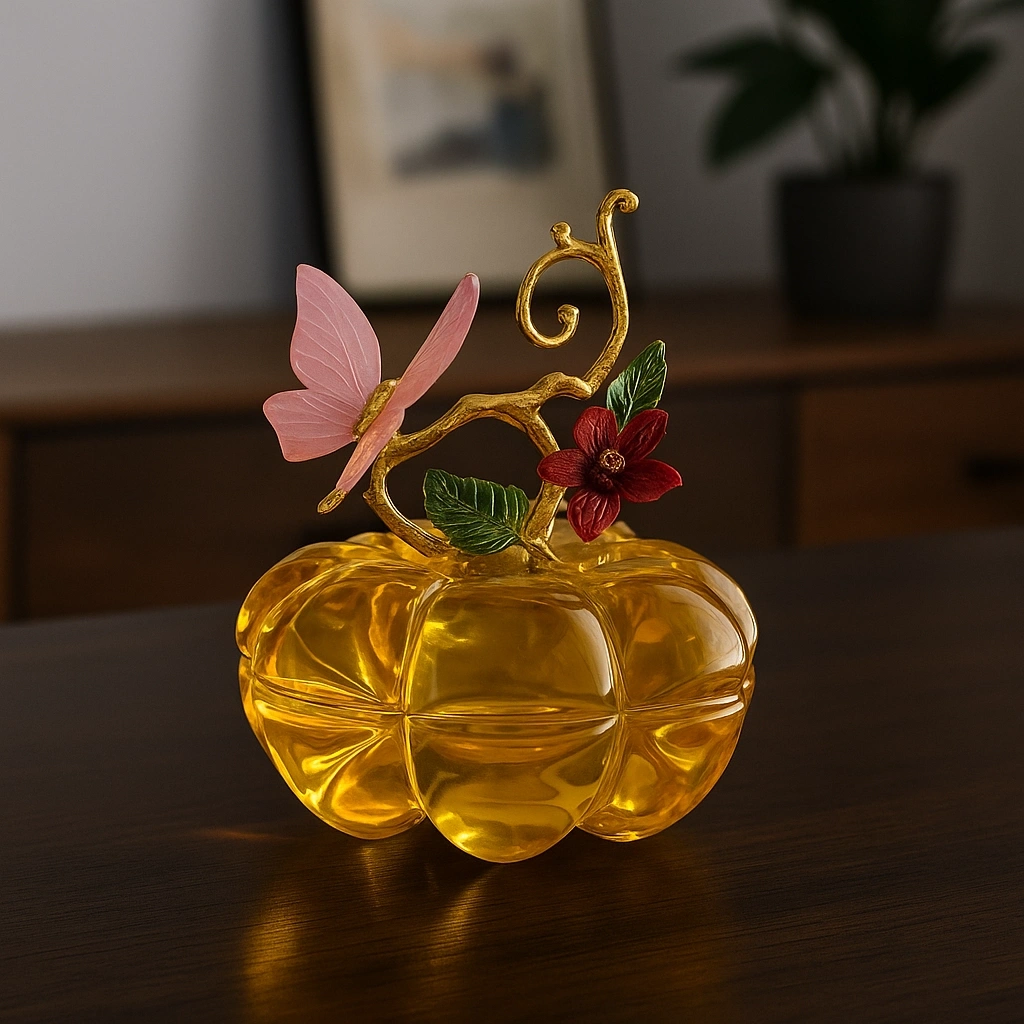Yeşil kristal gövdesi ile dikkat çeken bu obje, üst kısmındaki altın tonlu yaprak ve mor renkteki zarif kelebek figürüyle adeta sanatsal bir dokunuş sunuyor.