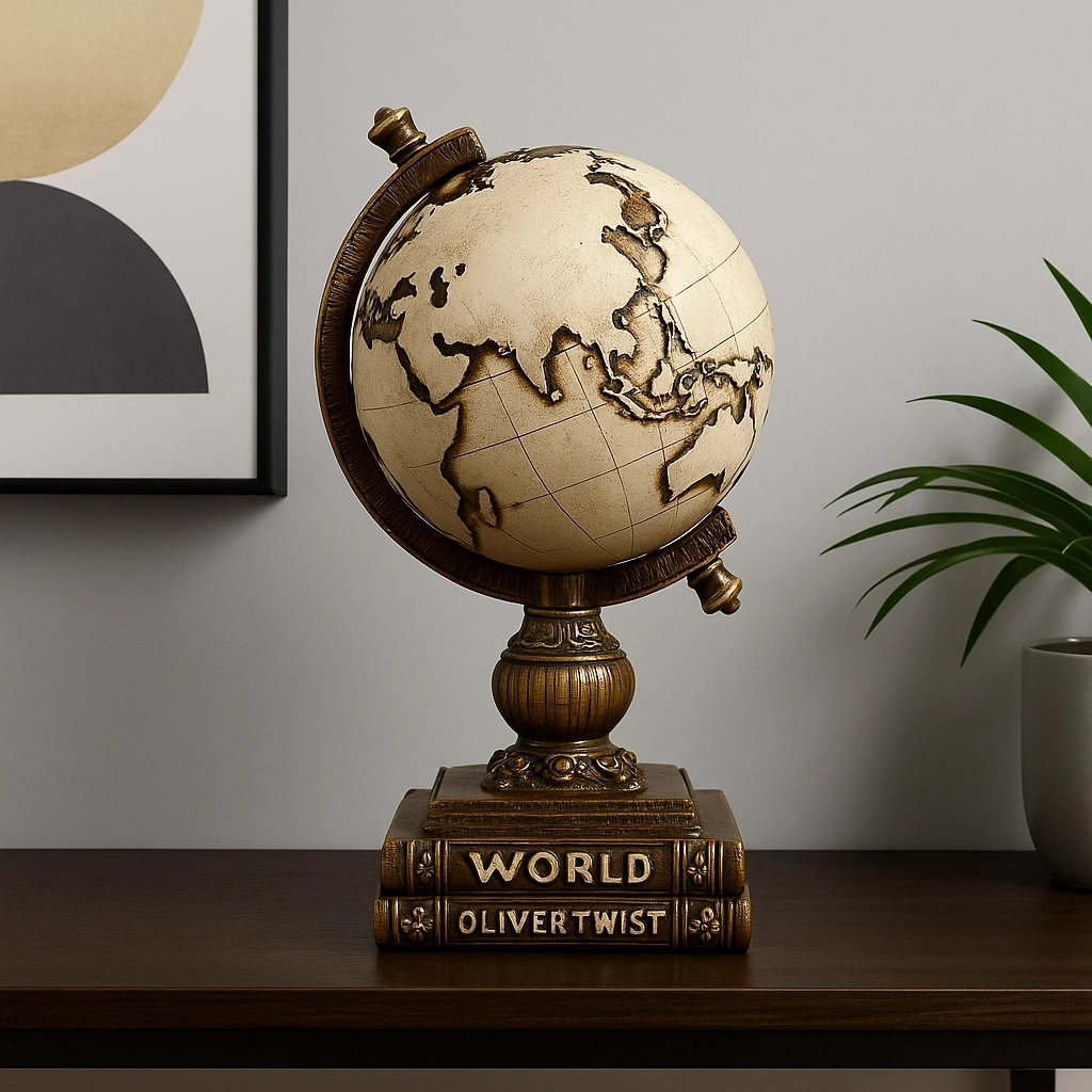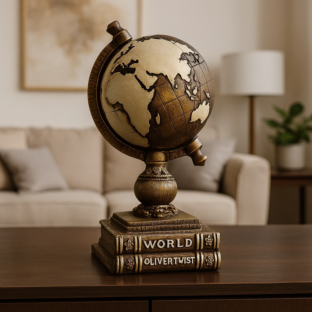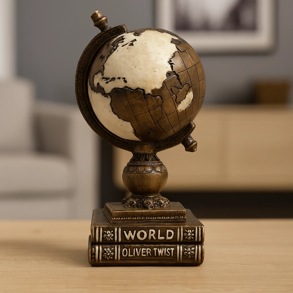 Kahverengi ve krem tonlarının uyumuyla tasarlanmış bu antik görünümlü dünya küresi biblo, kitap formundaki kaidesiyle geçmişin zarafetini günümüze taşıyor. Üst kısmındaki küre, coğrafi hatlarla detaylandırılarak el işçiliği dokusunu yansıtır. Retro tarz sevenler için özenle hazırlanmış olan bu biblo, ister ofis ister salon dekorasyonunda güçlü bir estetik unsur olarak öne çıkar.