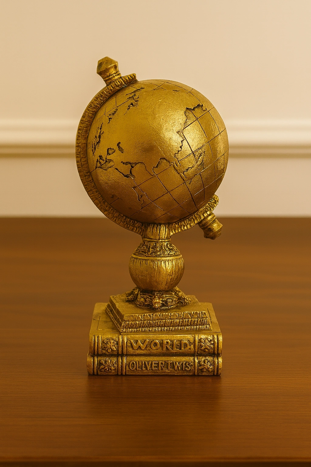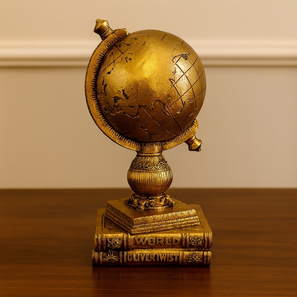 Parlak gold rengiyle ihtişamı ve zarafeti yansıtan bu dekoratif dünya küresi, lüks tasarımıyla dikkat çeker. Üzerindeki ince işlenmiş kıta detayları ve kitap formundaki kaidesi, ürünü hem estetik hem de anlamlı bir dekor parçası haline getiriyor. Modern ve klasik dekorasyonlarda şıklığıyla öne çıkan bu biblo, özellikle salon ve ofislerde prestijli bir hava katar.